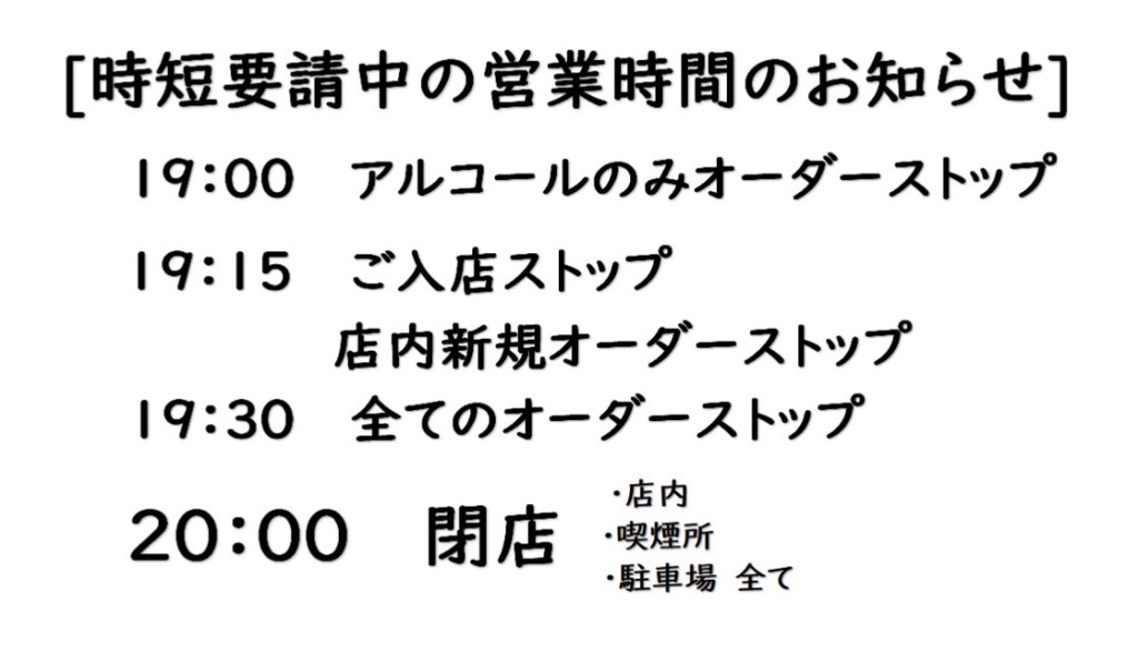 時短要請中の営業時間のお知らせ 投稿日: 2020年12月28日2021年1月28日 投稿者 kurobeko いつも、ステーキ黒べこ。をご利用頂き、ありがとうございます。 この度の飲食店時短要請に伴い、解除されるまで上記の時間に営業時間を縮小させて頂きます。ご迷惑お掛け致しますが、何卒、ご理解の程、宜しくお願いいたします。 評価:共有:Tweet 友達にメールでリンクを送信 (新しいウィンドウで開きます) メールアドレス 印刷 (新しいウィンドウで開きます) 印刷 いいね 読み込み中…