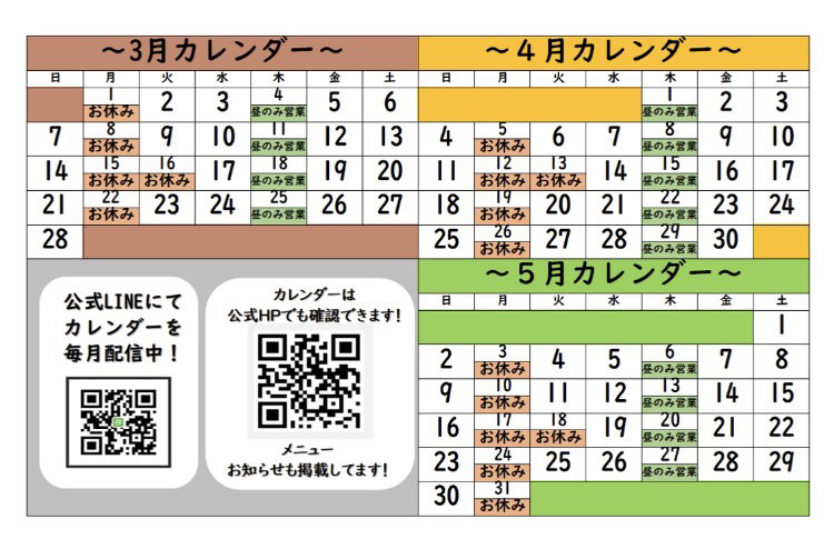 2021年3.4.5月の営業日カレンダー 投稿日: 2021年3月22日2021年3月22日 投稿者 kurobeko 評価:共有:Tweet 友達にメールでリンクを送信 (新しいウィンドウで開きます) メールアドレス 印刷 (新しいウィンドウで開きます) 印刷 いいね 読み込み中…