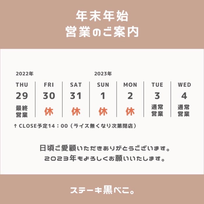 今年も残りわずかですね。 年末年始の営業について、お知らせします。 宜しくお願いいたします。